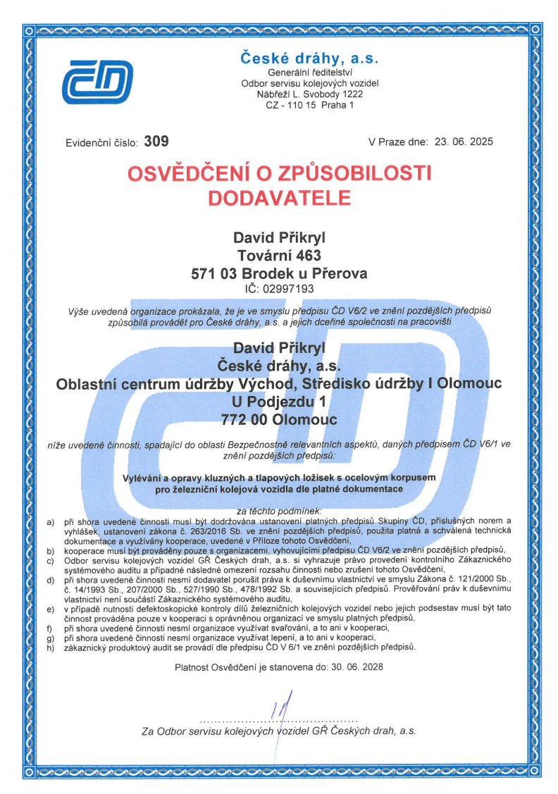 Držím Osvědčení o způsobilosti dodavatele ČD č. 309, které potvrzuje splnění přísných požadavků na opravy a vylévání kluzných ložisek.